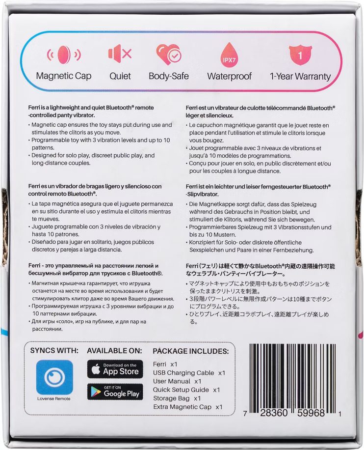Experience next-level teasing with the LOVENSE Ferri, a sleek magnetic panty vibrator built for powerful, discreet pleasure. Its ultra-quiet motor delivers deep, rumbly vibrations that you can control via the Lovense app, whether you’re across the room or miles away. Perfect for couples who love public play or solo fun, Ferri stays securely in place and heats up your foreplay anytime, anywhere.